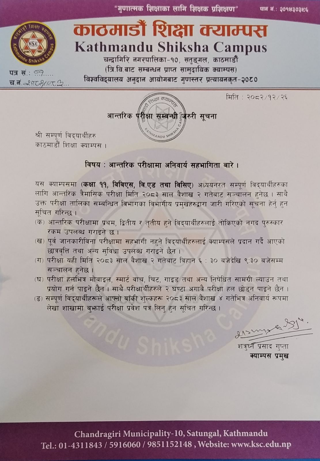 अन्तरिक परीक्षा सम्बन्धि जरुरी सुचना |