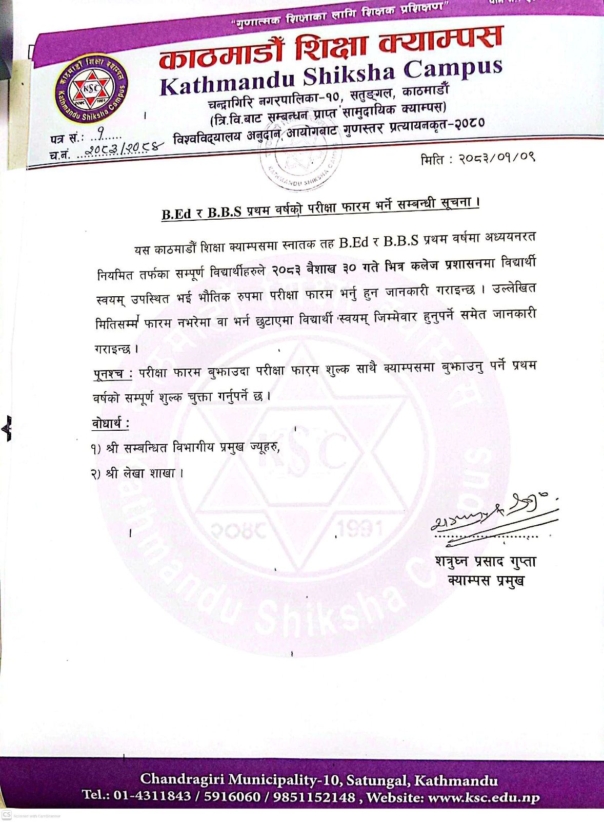 B.Ed र BBS प्रथम वर्षको परीक्षा फाराम भर्ने सम्बन्धि सुचना |